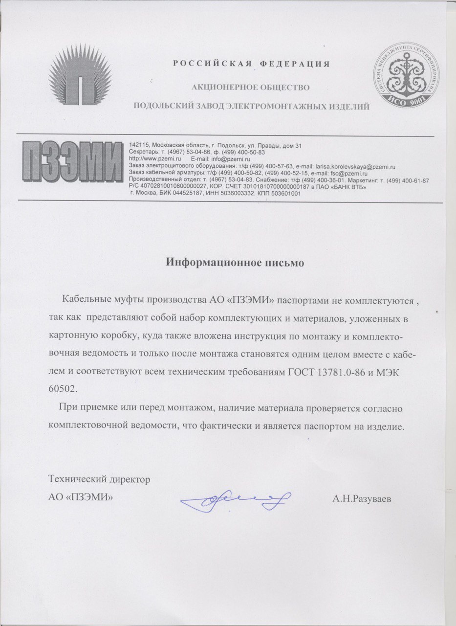 ОписаниеСоединительная муфта 1ПСт35- 50-В для одножильного кабеля с алюминиевой или медной жилой с изоляцией из сшитого полиэтилена внутренней и наружной установки без брони на напряжение до 35 кВ сечением 50 мм.кв с болтовым соединителем производства АО ПЗЭМИ (Подольский завод электромонтажных изделий)